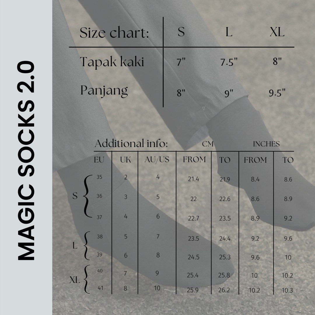 – Semua saiz kaki dapat memakai socks ini kerana terdapat 3 saiz yang berbeza iaitu S , L, XL